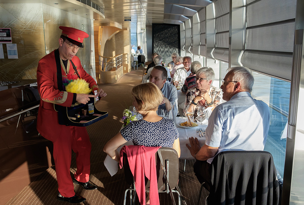 Vier Stunden lang durften die Gäste auf dem grössten Zürichsee-Schiff verbringen. Sie genossen ein köstliches Vier-Gänge-Menü und beste Unterhaltung. Für heitere, lüpfige Stimmung sorgte das Ländler-Quartett «Echo vom Sunnematt». Getreu dem Motto «1 Jahr Zauber und Spektakel» brachte Zauberer und Entertainer Martin Iarrera alias Nobi die Gäste mit seinen Tricks, Scherzen und seinem Sprachfehler zum Lachen und Staunen.