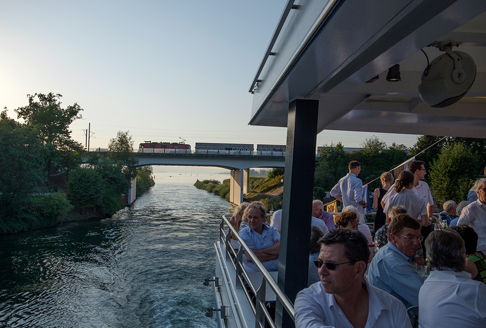 Wie eine orange Kugel steht die Sonne über dem Zimmerberg. Rasch verschwindet sie dahinter und taucht den Himmel an diesem lauen Spätsommerabend in ein wunderbares Orange. Mitten in dieser Idylle gleitet die Panta Rhei über den Zürichsee, an Bord die Genossenschafterinnen und Genossenschafter der Sparcassa 1816 mit ihren Begleitpersonen.